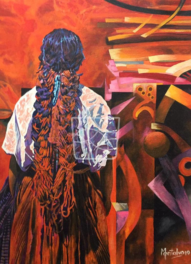 Una jóven mujer con atuendo simple y con traje típico, aunado a expresionismo de colores apastelados.