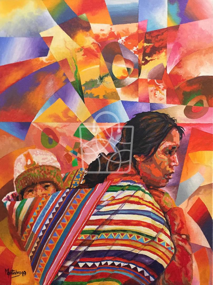 Es la representación de la mujer dando protección y amor a su hijo en el clásico estilo andino. Expresión con nuestros colores vibrantes del ande.